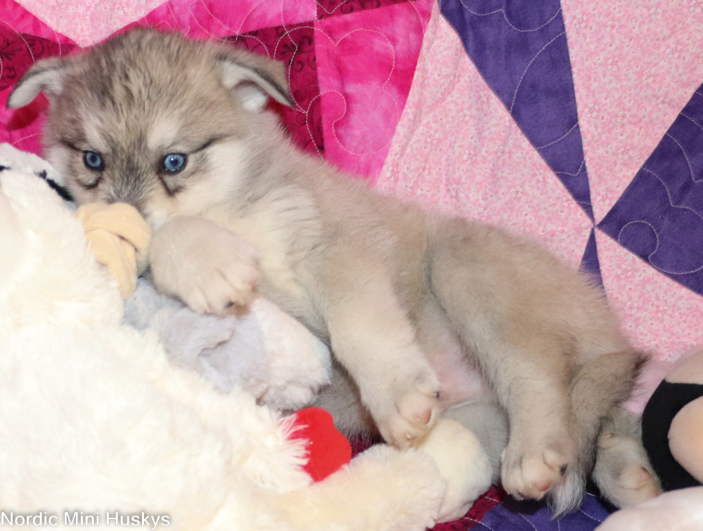 This little lover is going to a beautiful dark grey and white. He is a very loving puppy, playful and curious. He looks like he will be a small standard when grown. His ears will stand up straight in a week or so.