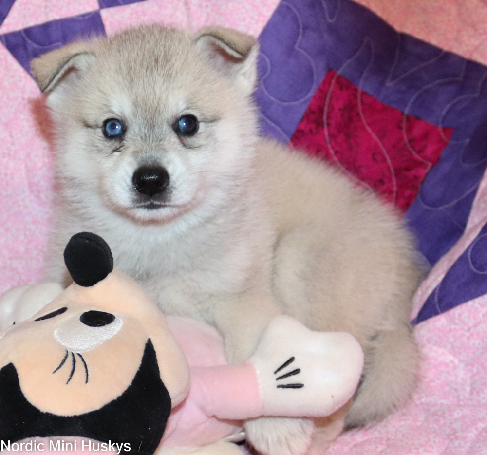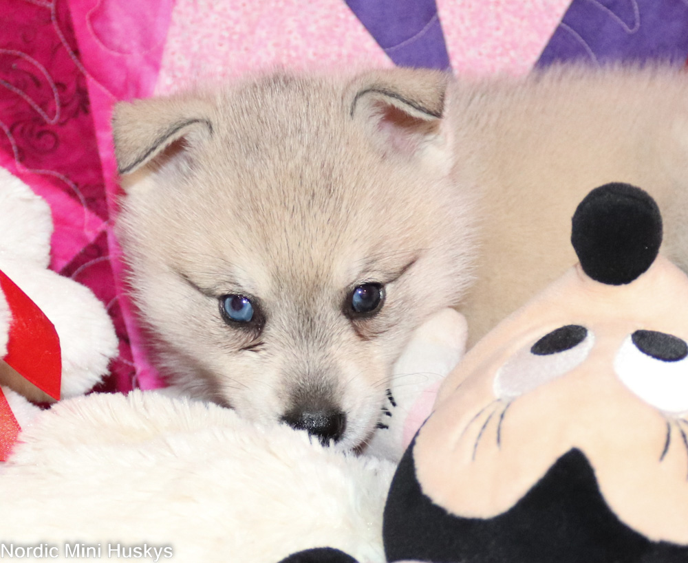 Aggie’s grey and white blue eyed and parti-eyed girl looks like she will be a mini when grown. She is so fluffy and cuddly. She is friendly, curious and at times very independent. She is a smart, sweet girl.