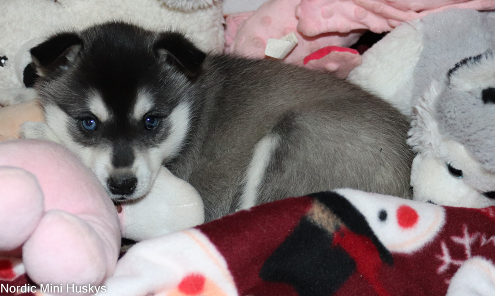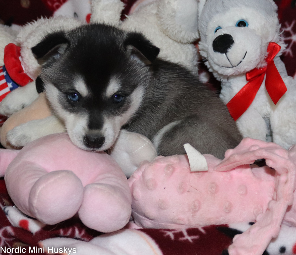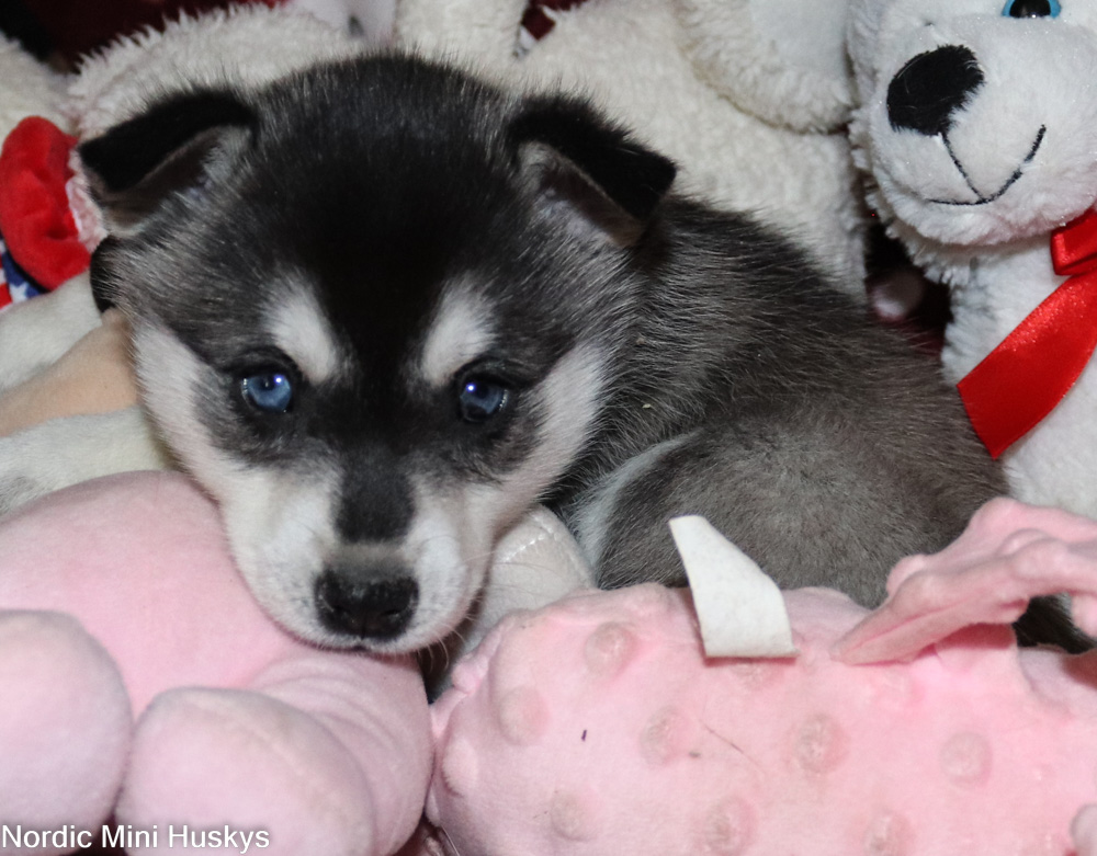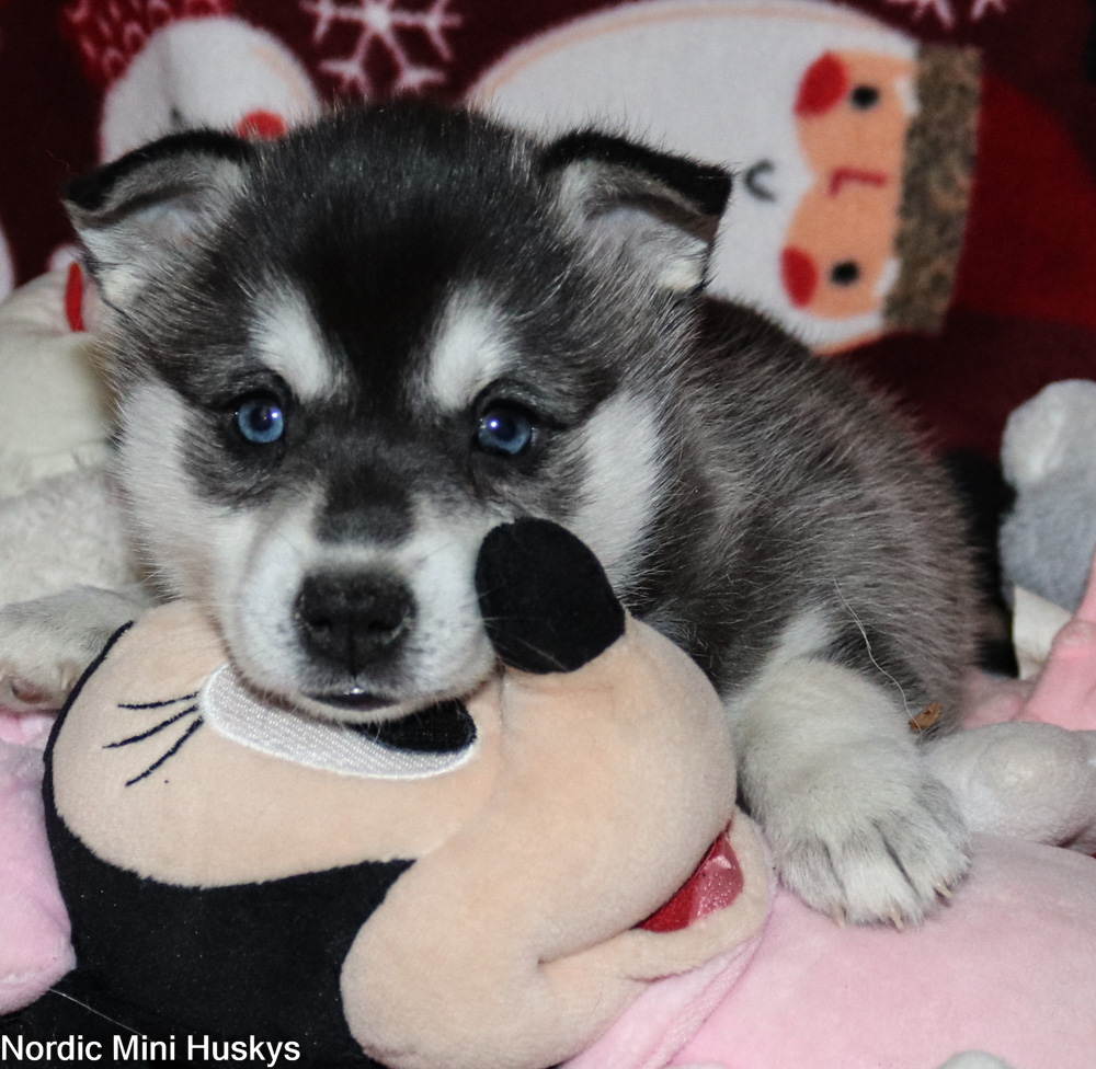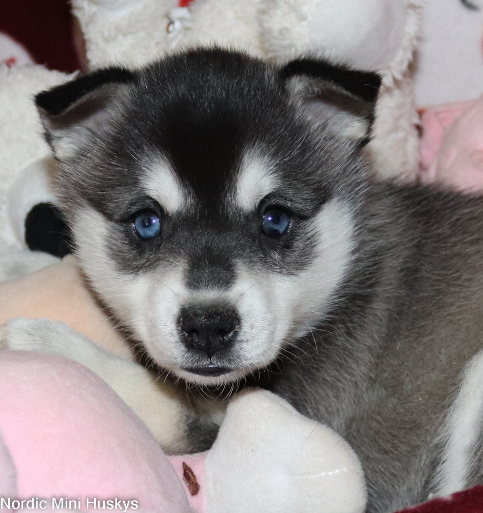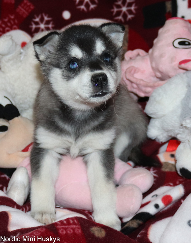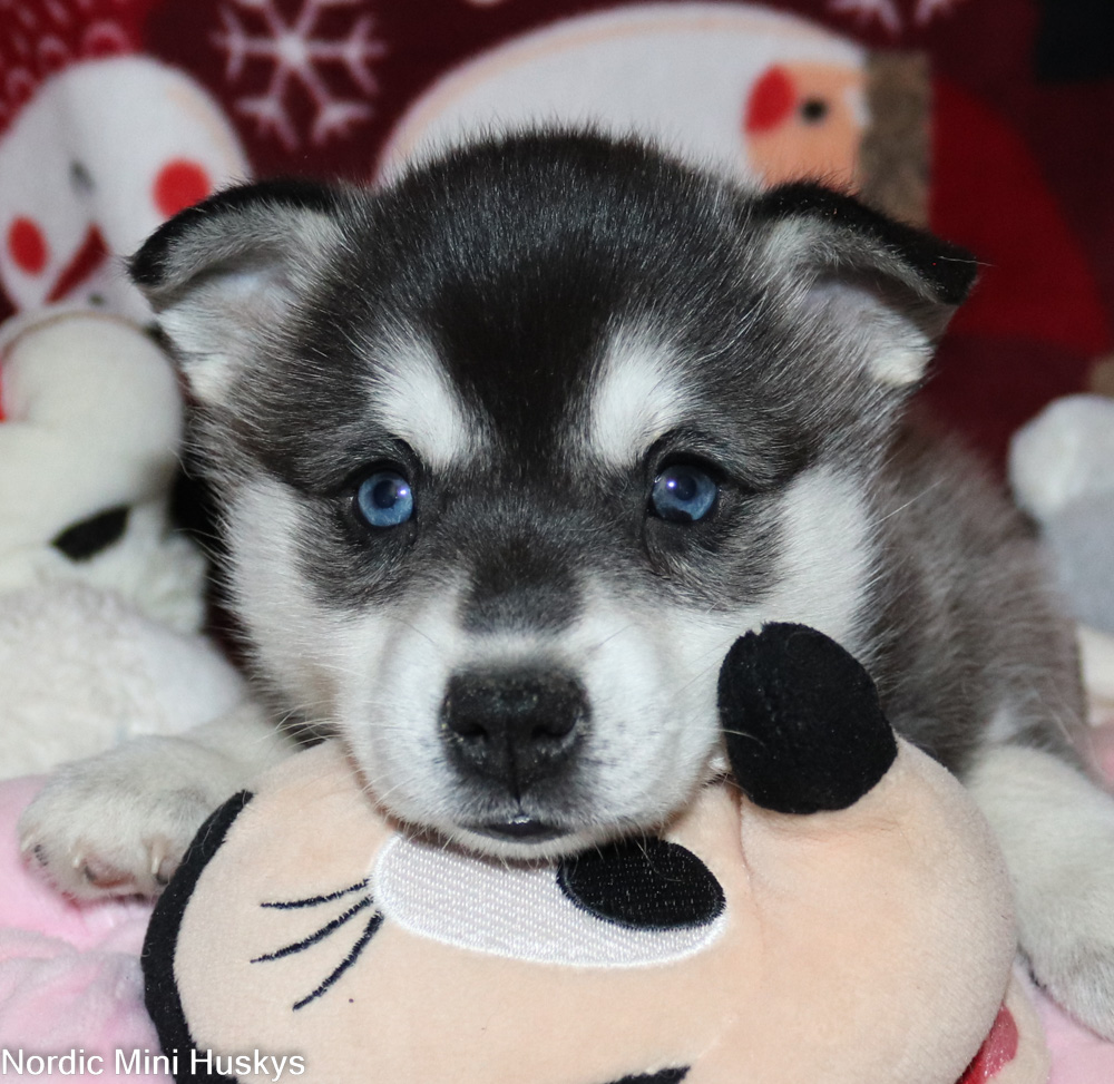 Artemis’s black and white blue-eyed girl looks like she will be a standard when grown.  This is a sweet, loving girl.  She is super cuddly. Loves to play and chew on her little toys. She is more on the quiet side for a Klee Kai. This is a sweet heart of a baby.