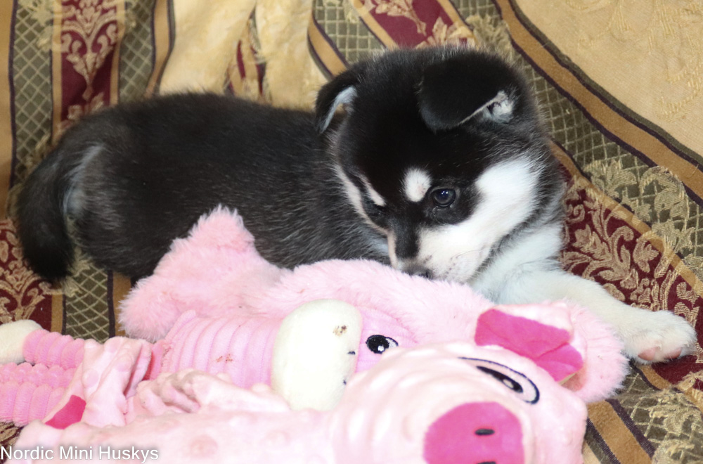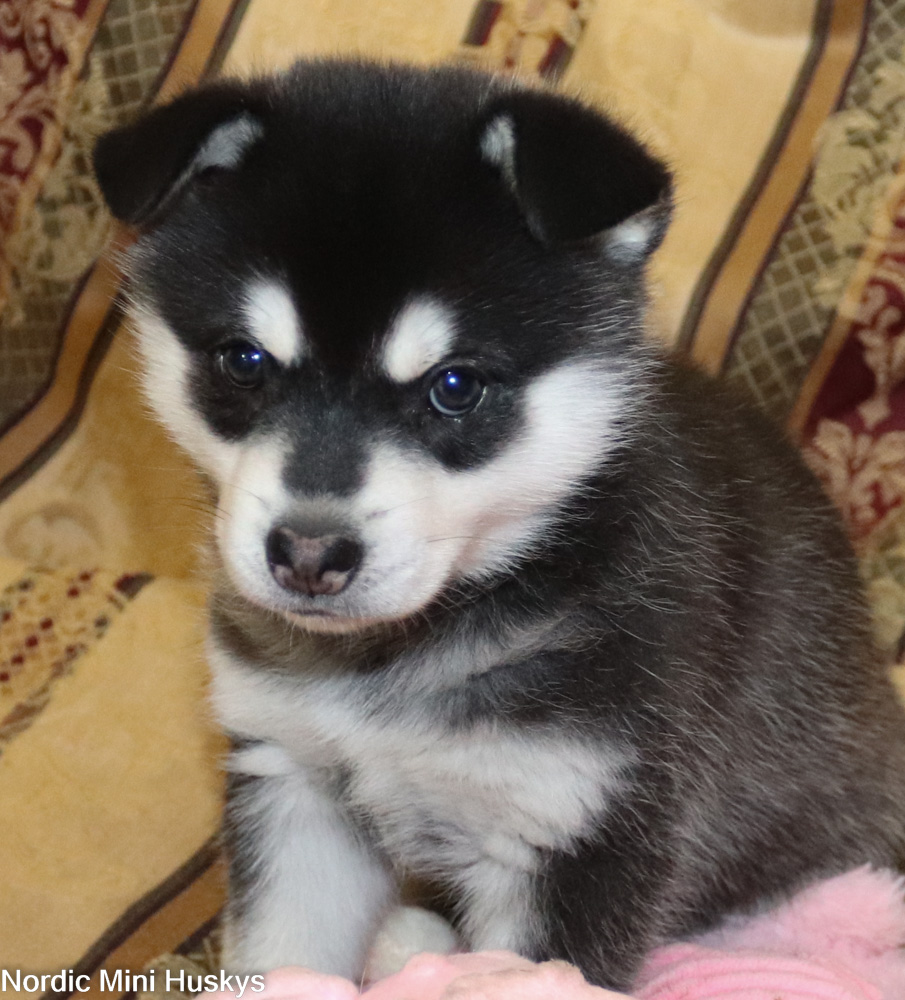 Coco B’s black and white fluffy brown eyed girl is so very very gentle and sweet. She looks like she will be a standard when grown. She is a very happy, very friendly girl. She is a little bit more on the calm side but still loves a good adventure. Her ears will stand straight up in a week or so.