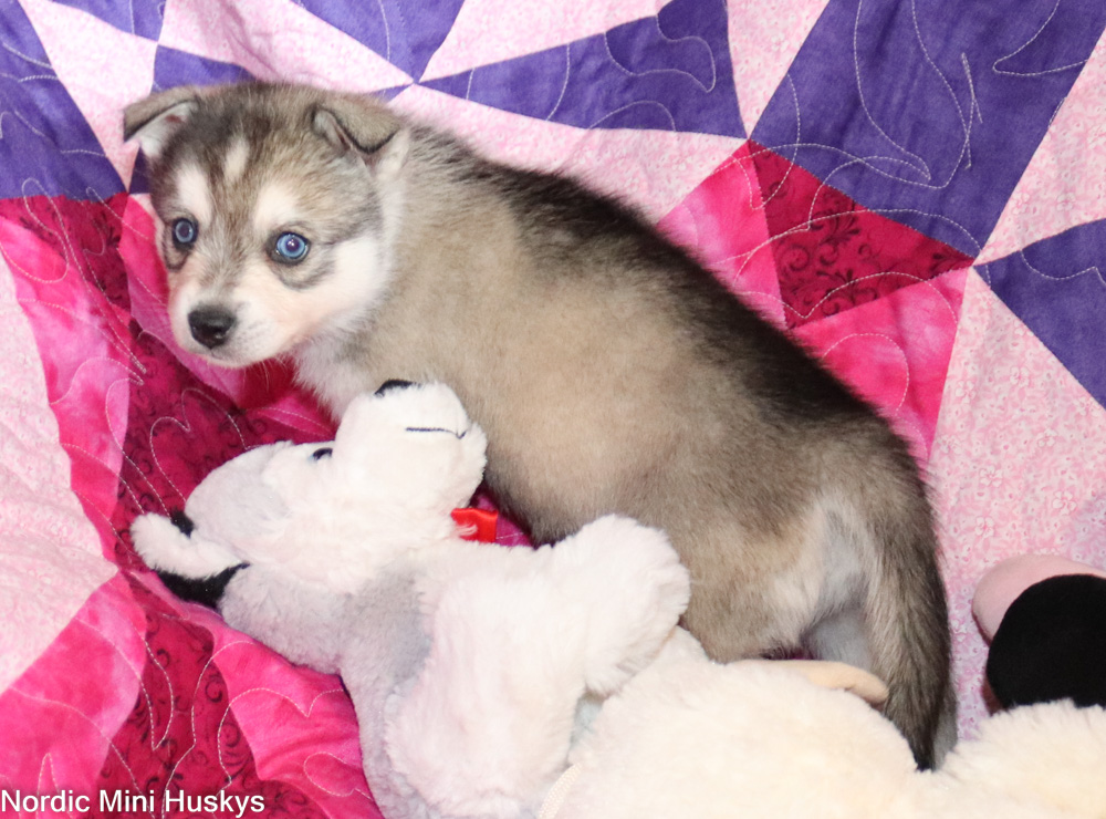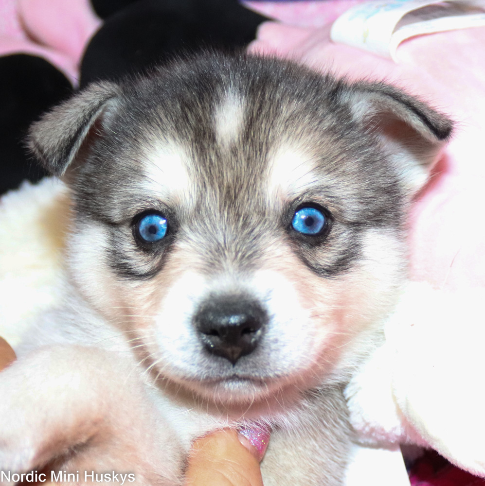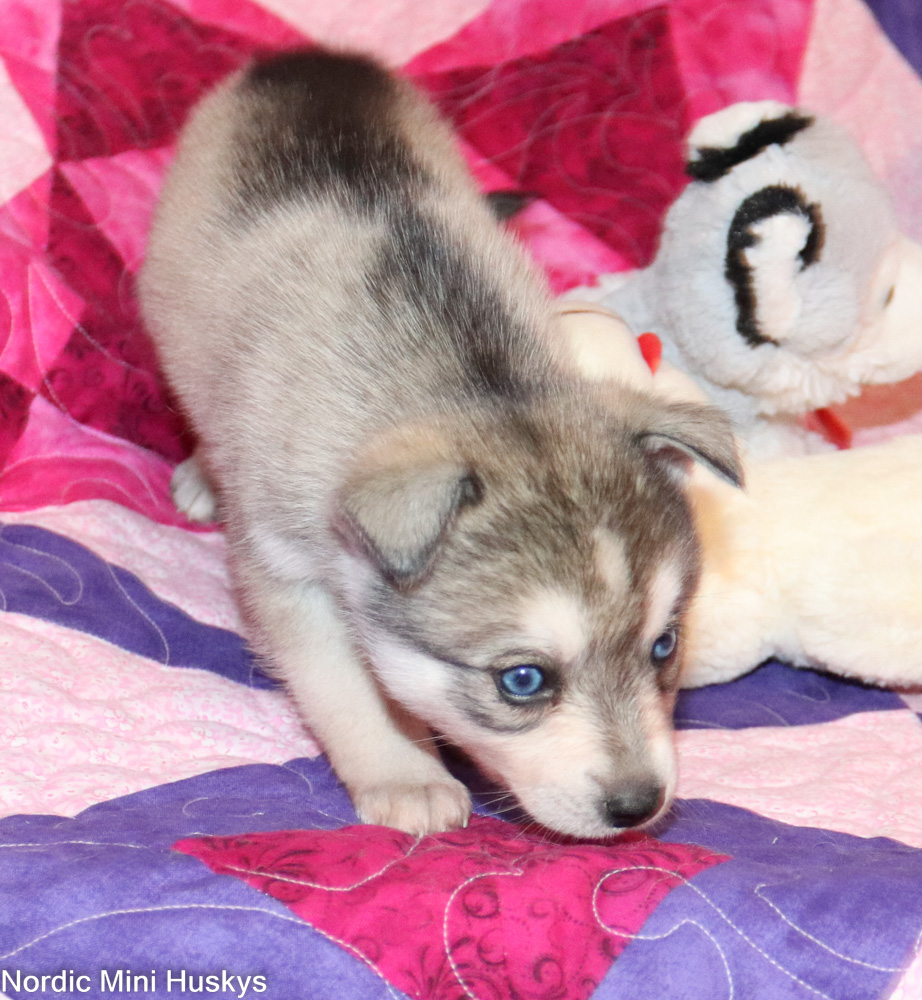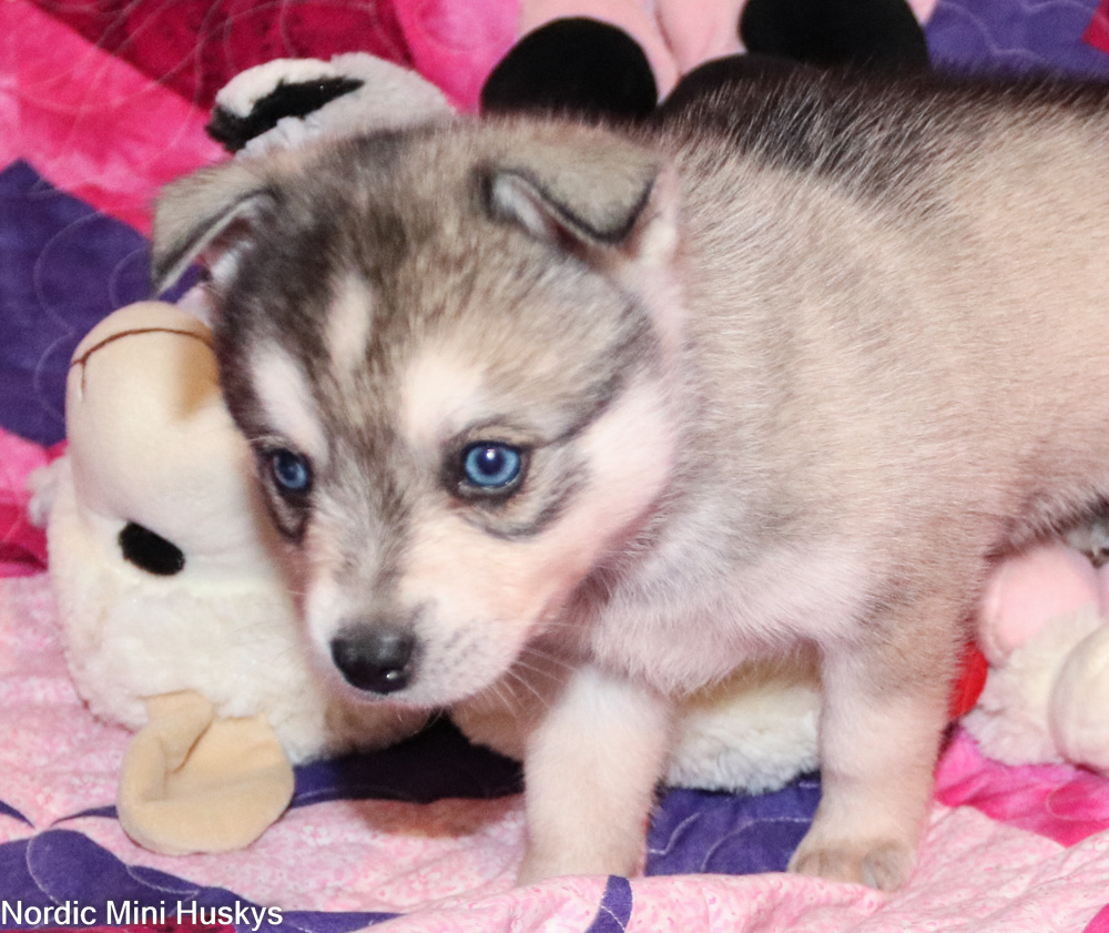 Can we say loves people and is super friendly? This guy is for sure that. He looks like he will be a small mini when grown. His ears will stand up in a week or so. He is a very sweet boy who is always the first to run over and great you.