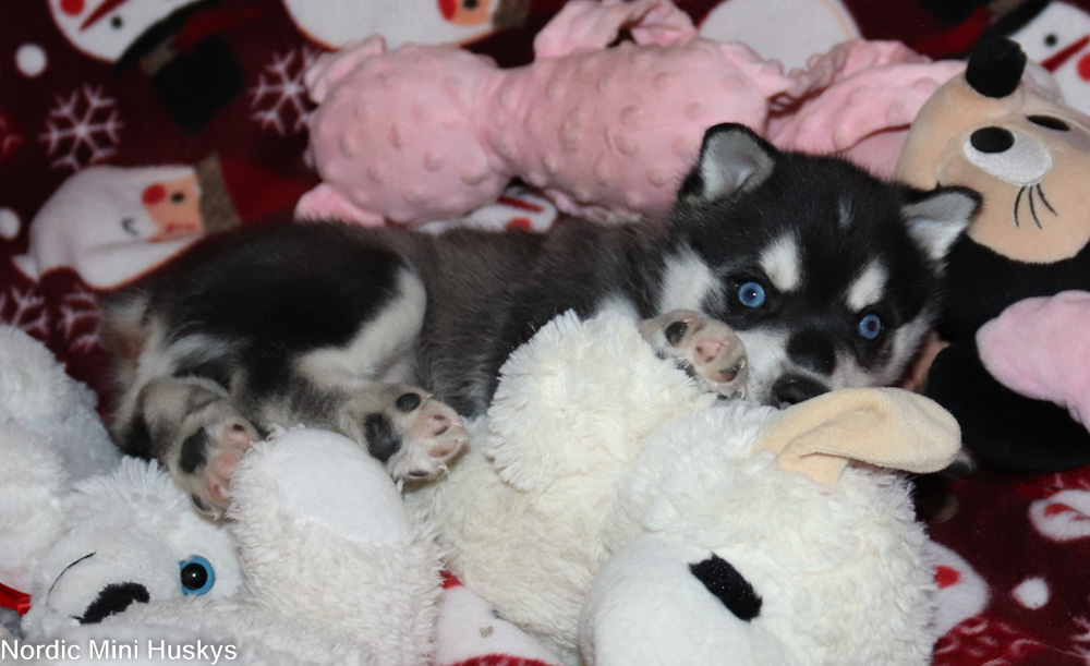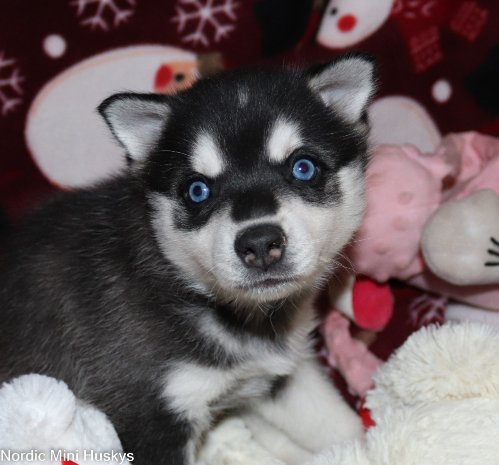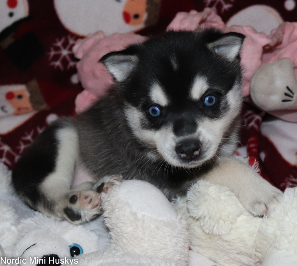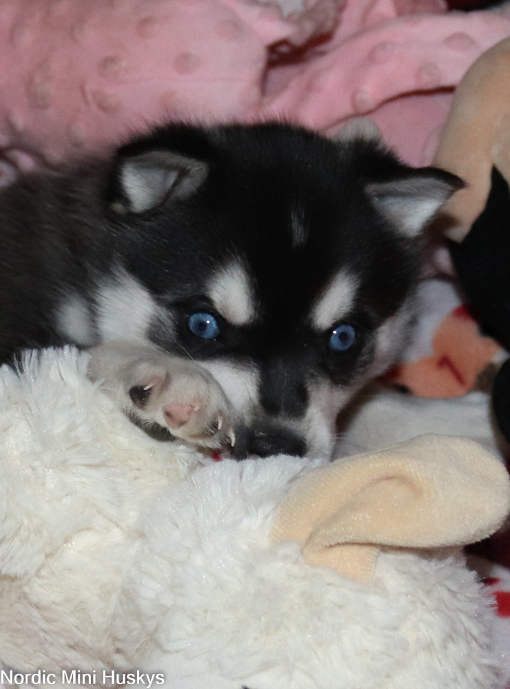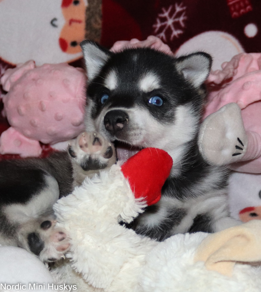 Frost’s black and white blue-eyed boy looks like he will be a standard when grown.  He is a happy-go-lucky guy.  He loves to play, and is a little independent, so he will explore on his own but loves to play with me too. He also loves his toys.  He is a bit reserved when he meets new people but is quickly overcoming that.