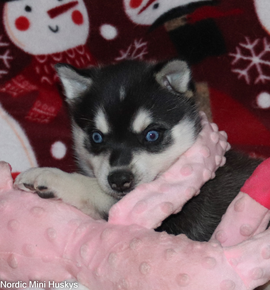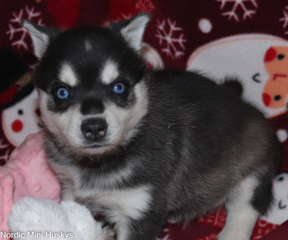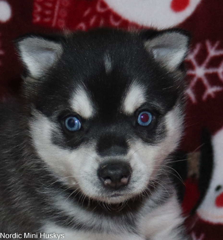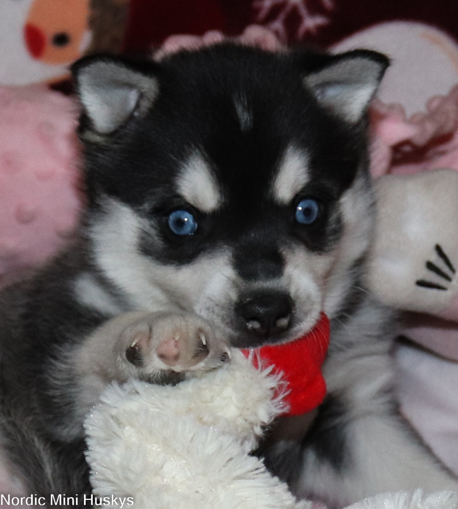 Frost’s black and white blue-eyed boy looks like he will be a standard when grown.  He is a happy-go-lucky guy.  He loves to play, and is a little independent, so he will explore on his own but loves to play with me too. He also loves his toys.  He is a bit reserved when he meets new people but is quickly overcoming that.