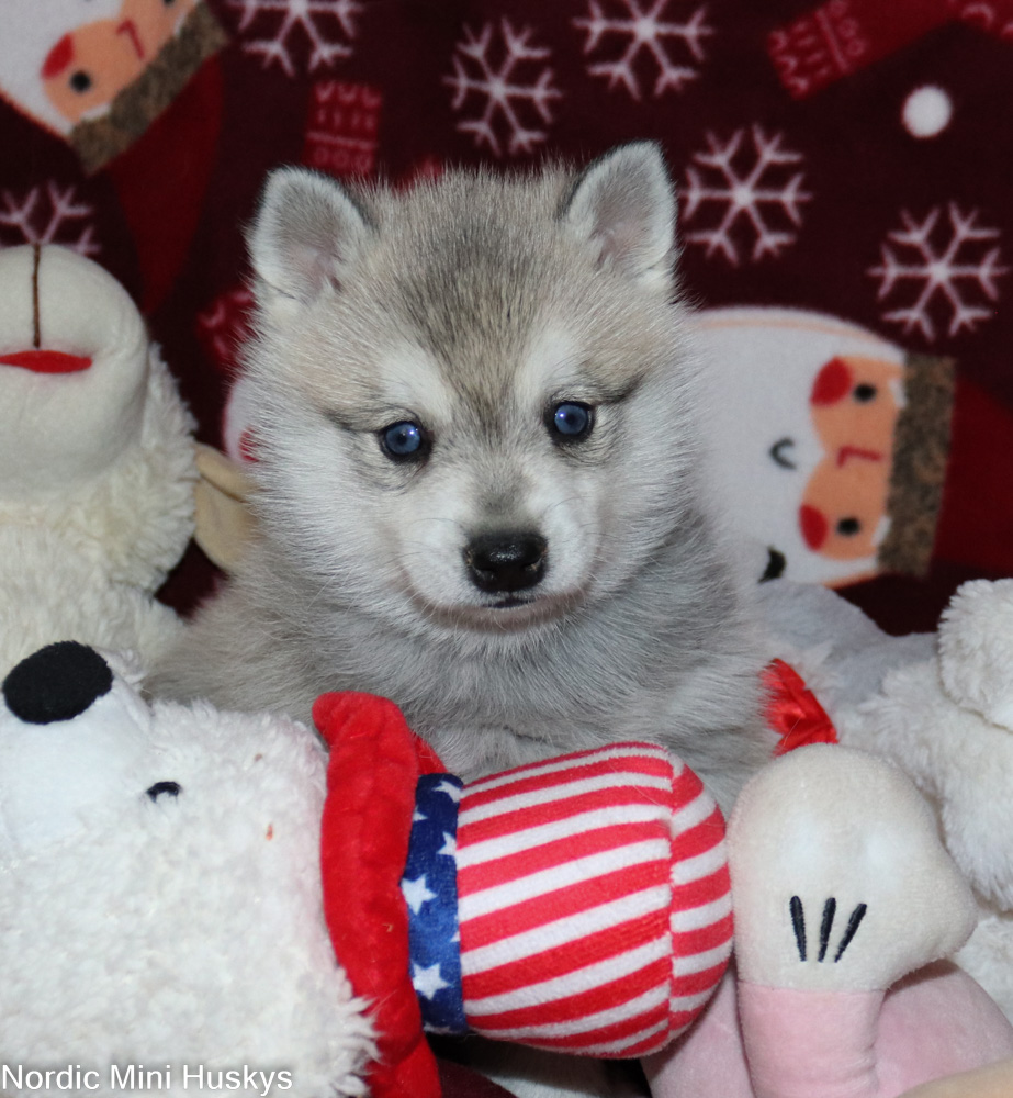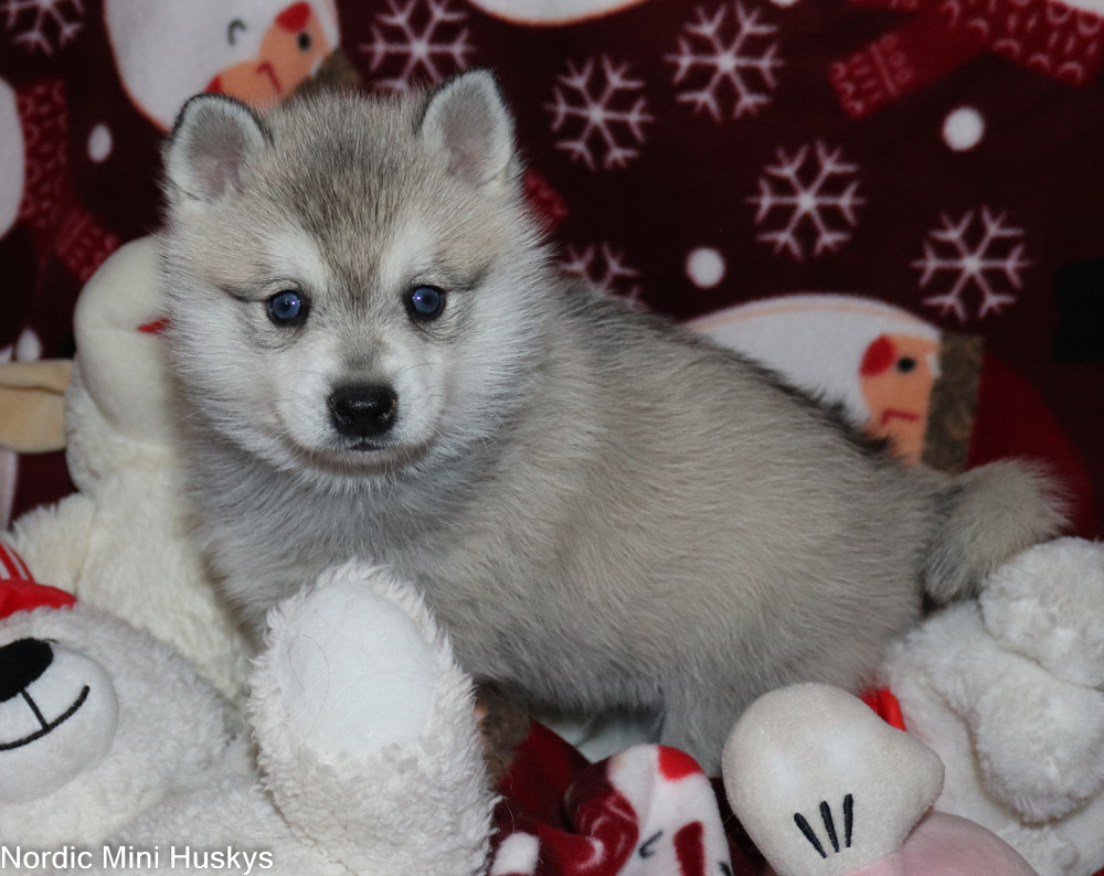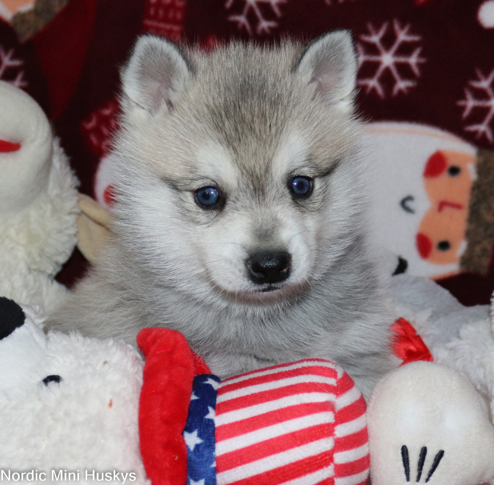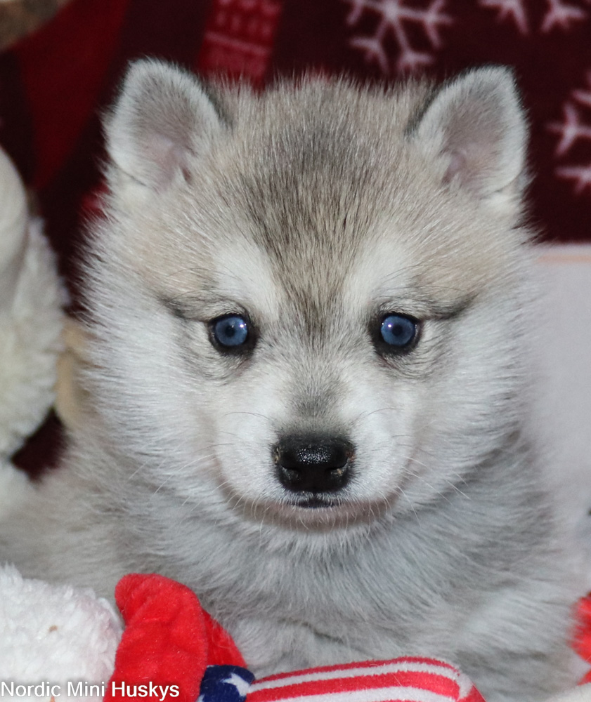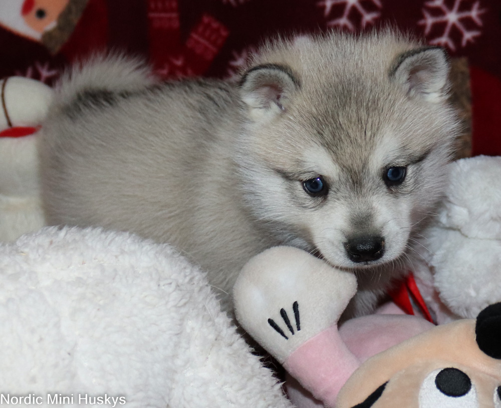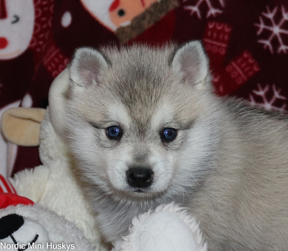Minerva’s grey and white blue eyed boy looks like he will be a small mini when grown. He is super fluffy as you can see from his pictures. He is a very chill little guy. He follows me everywhere, loves to be in my lap, loves to be petted and loved on. He is a happy, cuddly guy.