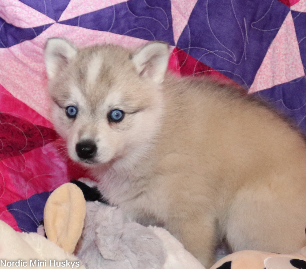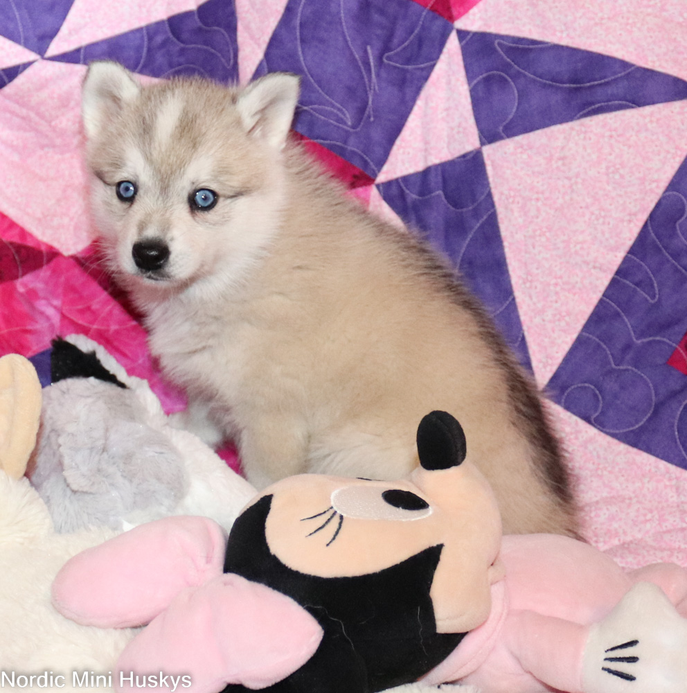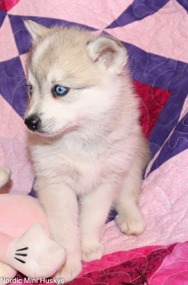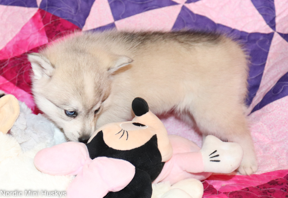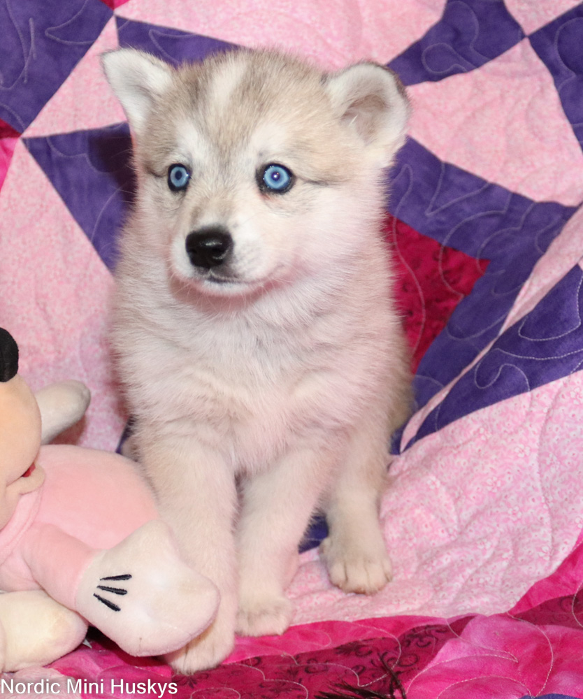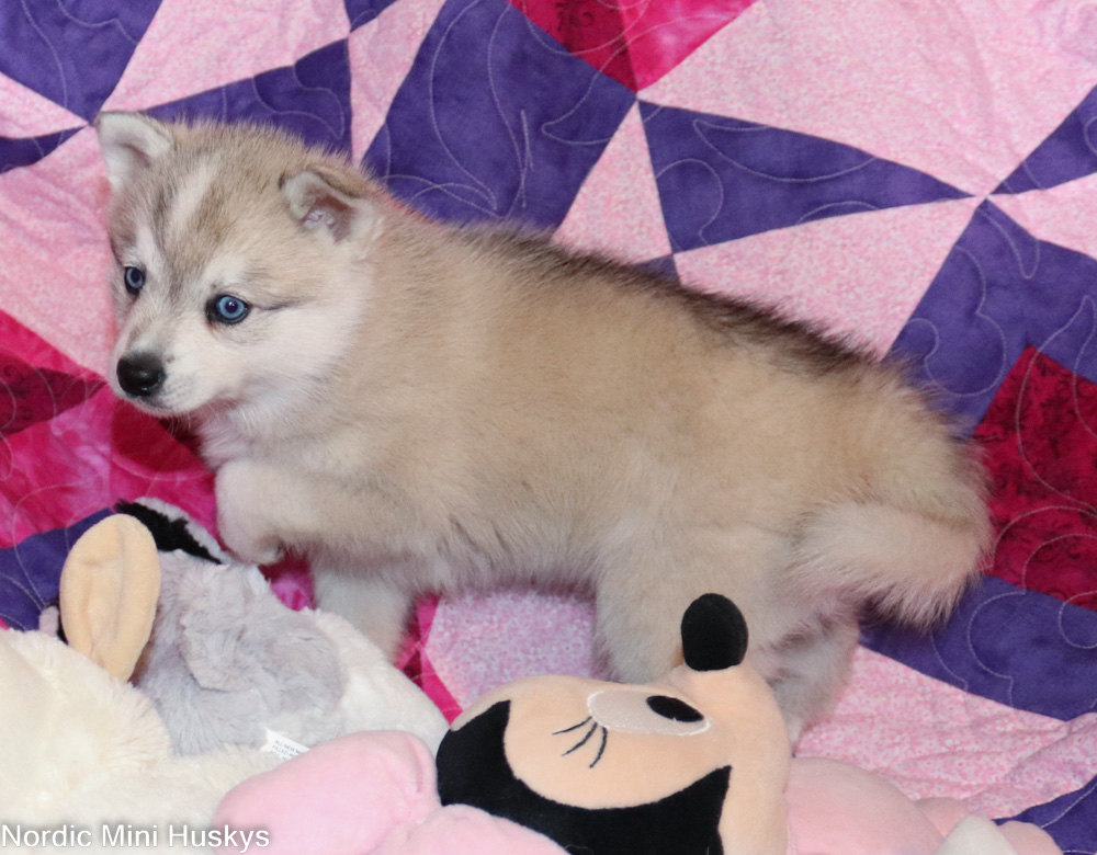 This adorable grey and white girl looks like she will be a mini when grown. She is very sweet, loves to play in your lap until she is so tired she falls asleep.  She has a loving demeanor. She can be a bit shy when first in a new situation but quickly overcomes it.