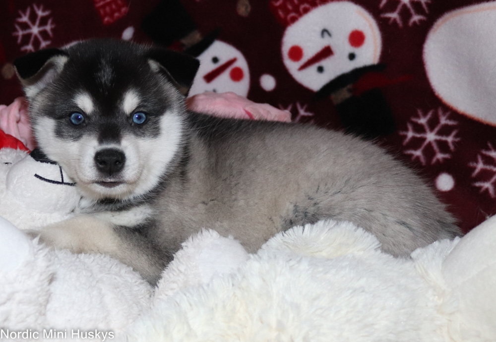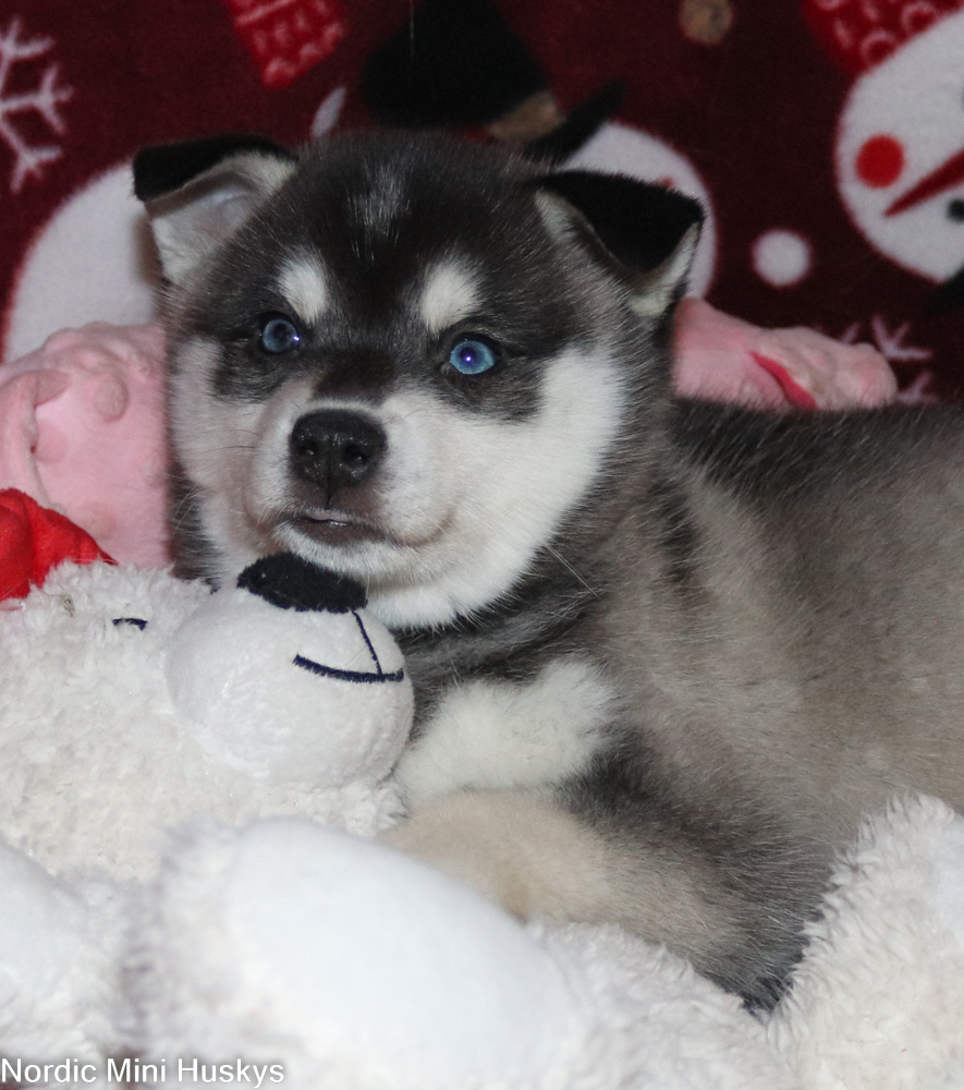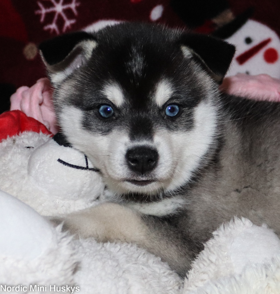 Opus’s black and white blue-eyed boy looks like he will be a large mini when grown.  This boy has the most luxurious coat. I find myself always picking him up to pet not only because he is so soft but he is a big cuddly fluff ball.  He is very easygoing.  Loves playing, of course.  He likes to be where I am, so is always underfoot following me around.  He has a lovely personality.