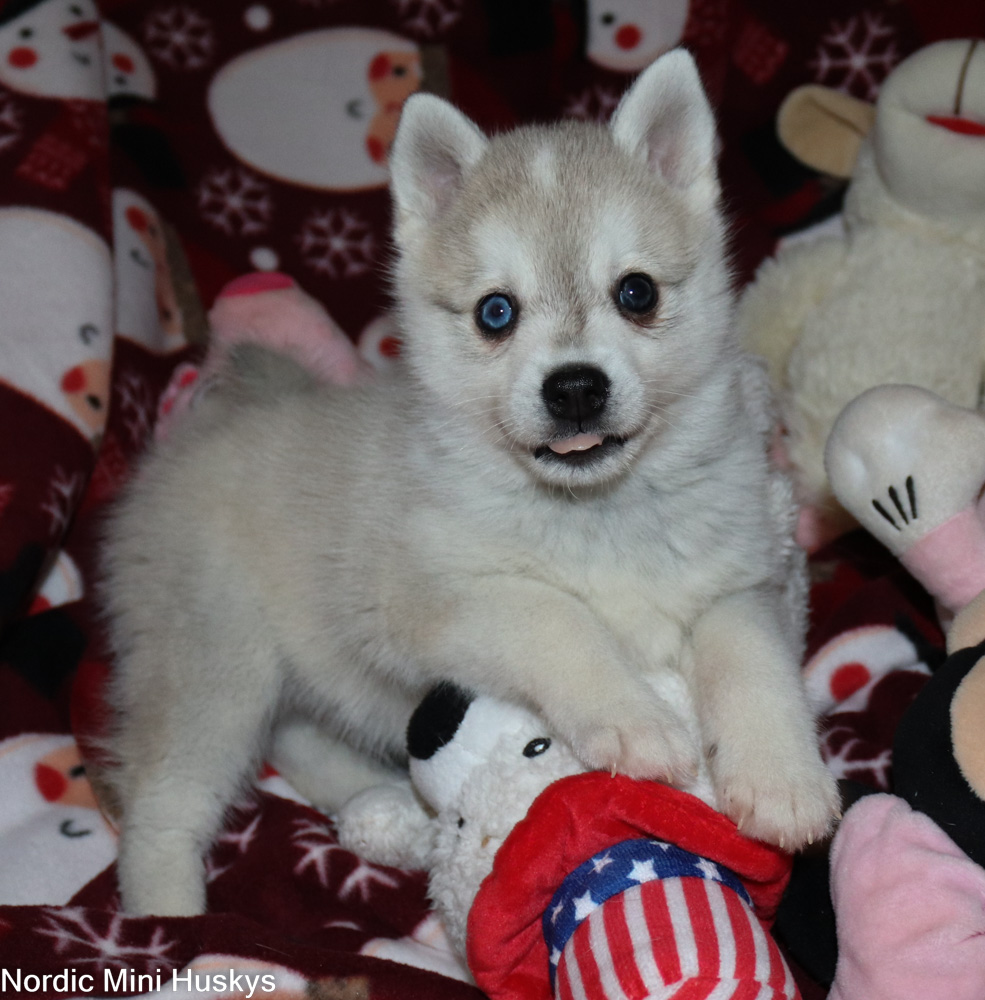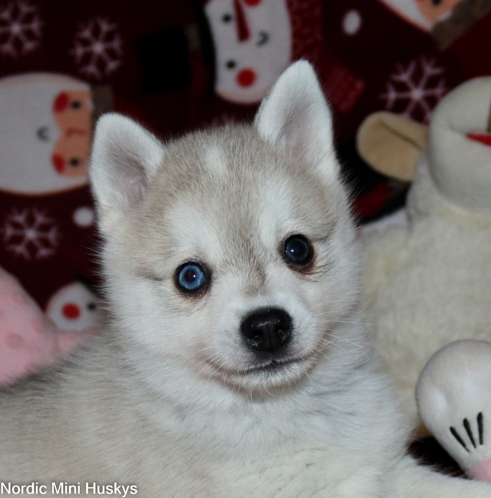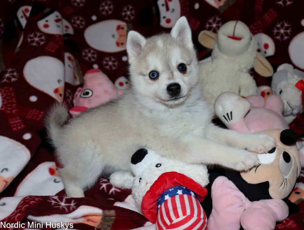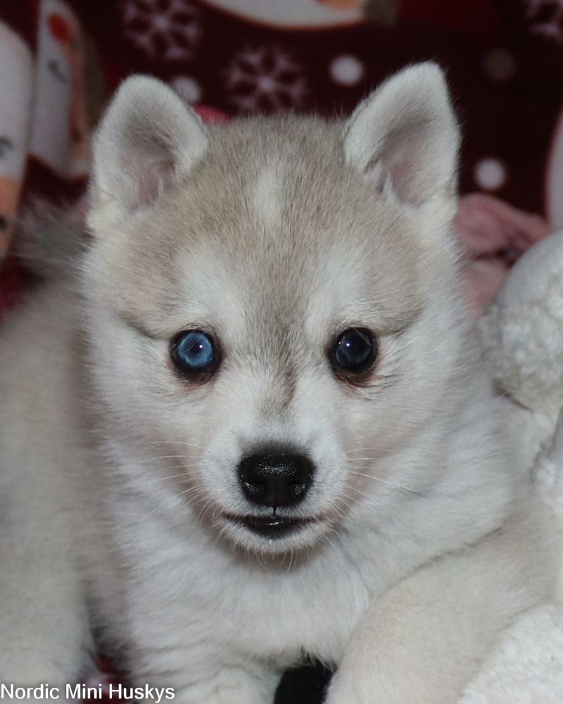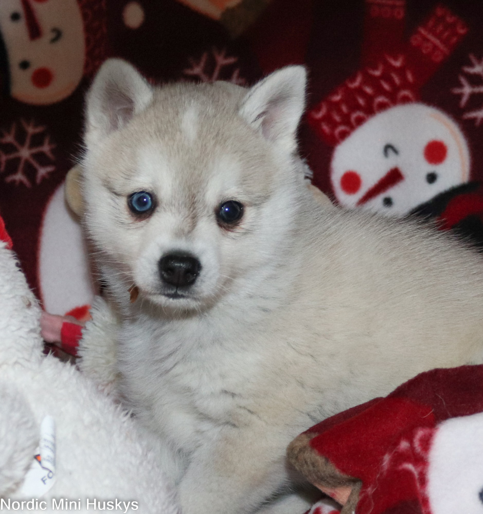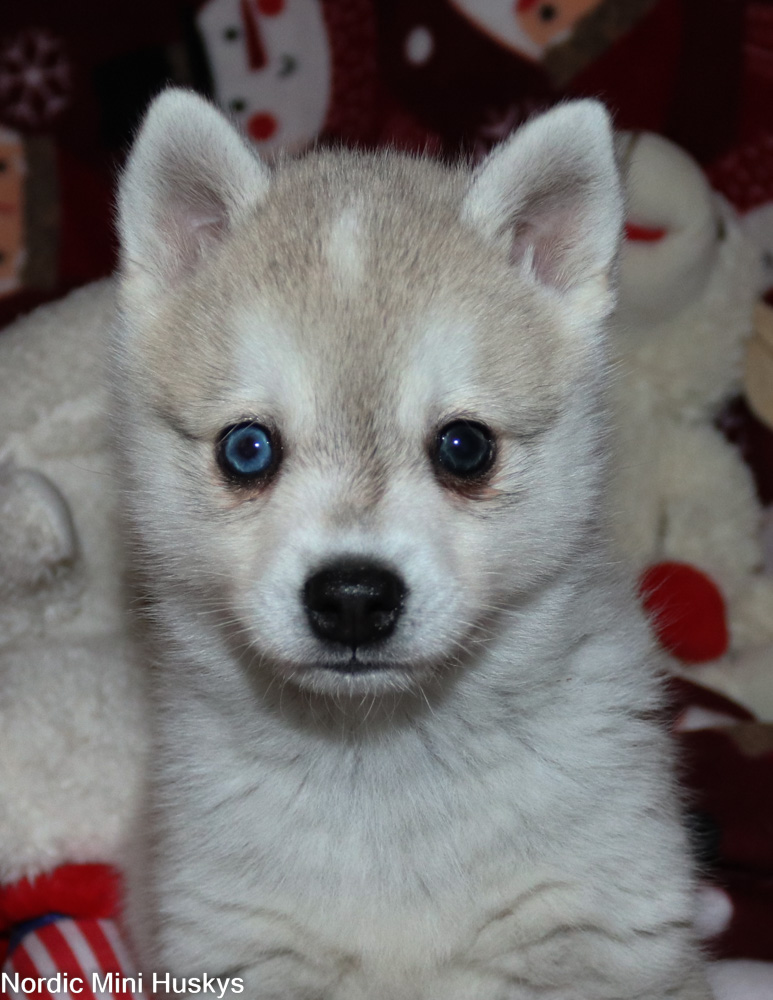 Opus’s grey and white bi-eyed boy looks like he will be a small mini when grown.  He is a handsome fellow with a fluffy soft coat.  I am always picking him up to kiss and cuddle. He is very outgoing, super playful and loving. He will play in my lap and then cuddle up to sleep. He is another of my puppies I find that I am always picking up to kiss.