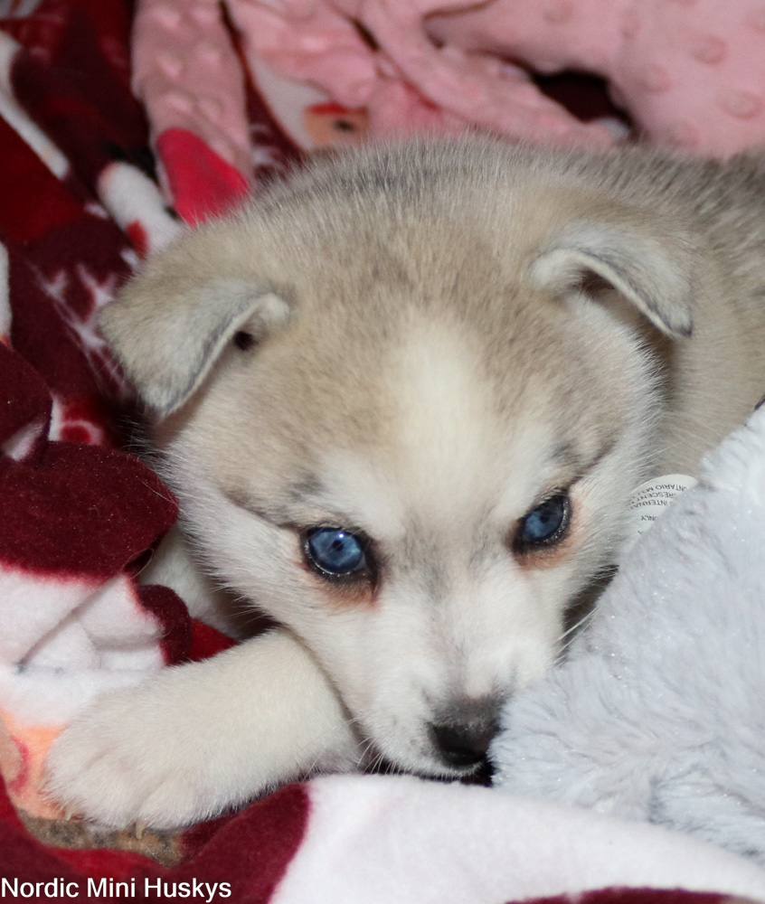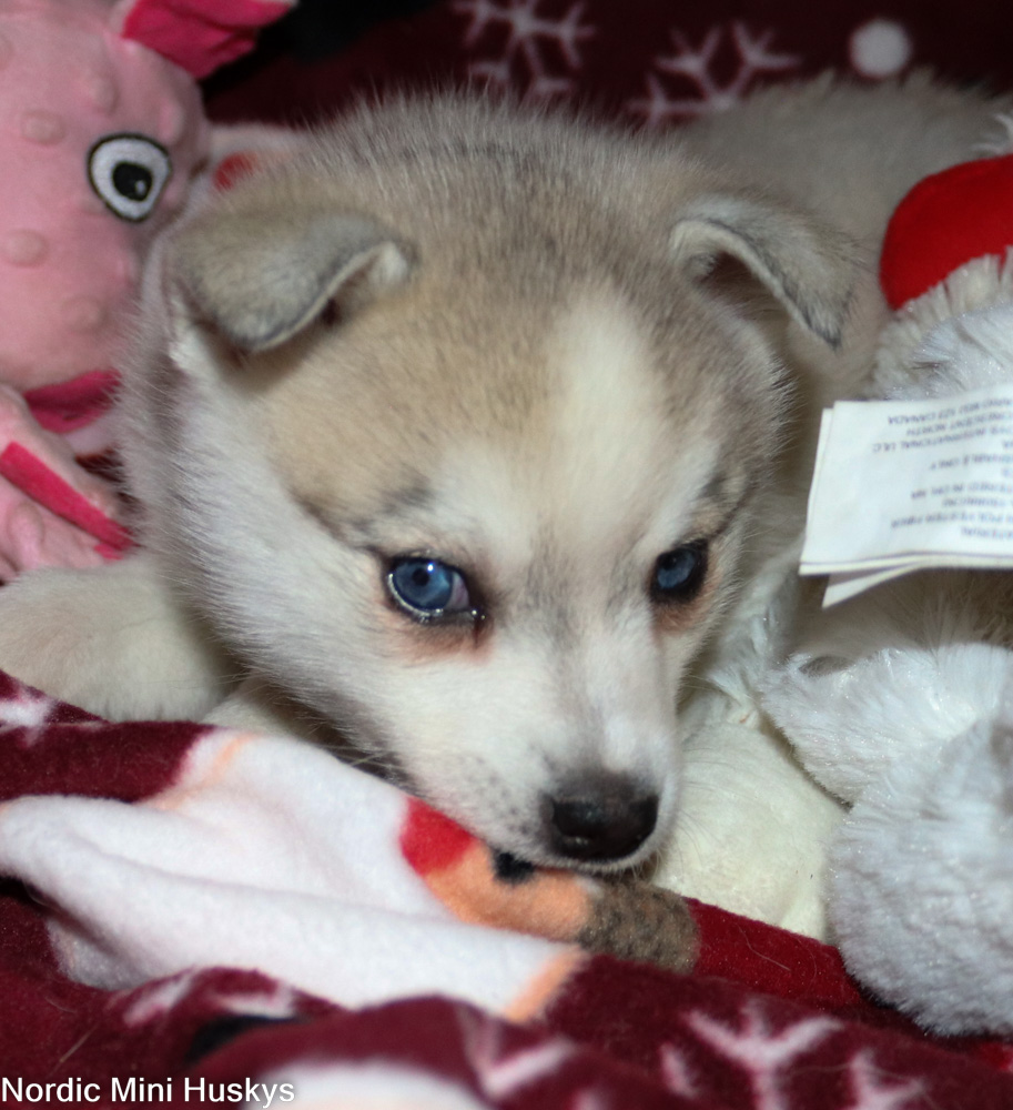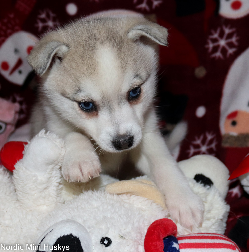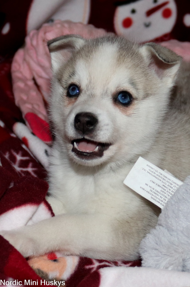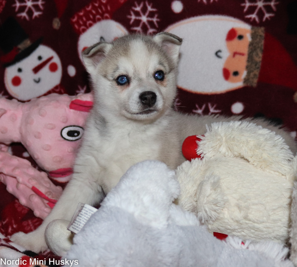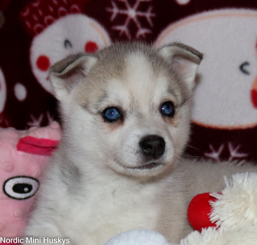 Opus’s grey and white blue-eyed girl looks like she will be a mini when grown. She will darken with age and her white stripe on her nose will get smaller but will always be there. This little girl is a sassy, playful, funny puppy. She is outgoing, loving and friendly. She loves attention when she is not playing.