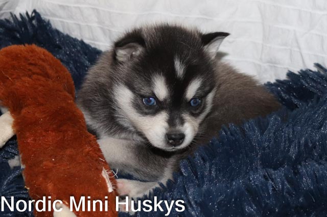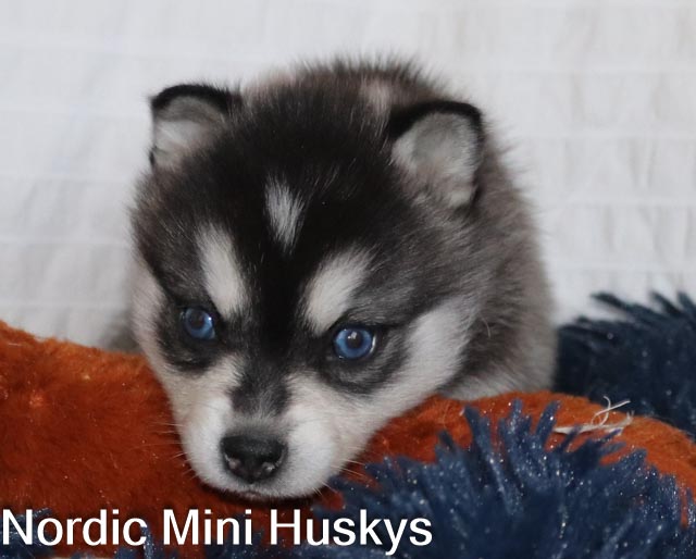 Mr Big Fluff is a black and white blue eyed miniature. He loves to talk. He will tell you all about everything. He also loves to lay over my lap while I pet his belly. Fully health tested.