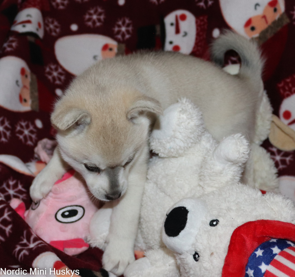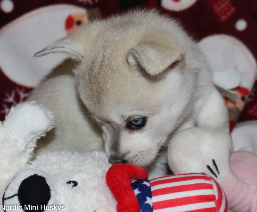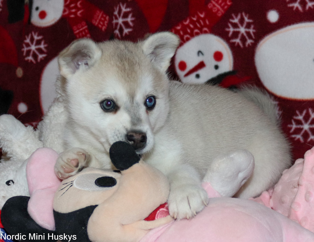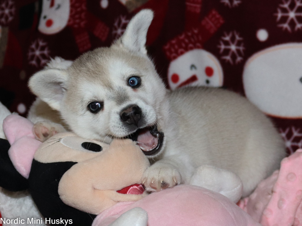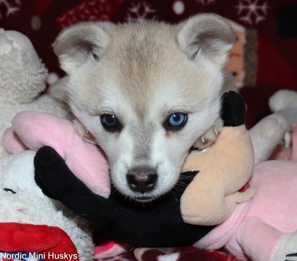 Thalia’s grey and white bi-eyed girl looks like she will be a standard when grown. This girl is very active, with you seeing what you are up to kinda of puppy. She is very outgoing, very playful and not afraid of much. She is super smart. She is a talker when she does not get her way. She loves to be with people. She does have a little bit of an overbite which does not affect her health. She most likely will outgrow this but it is not guaranteed.