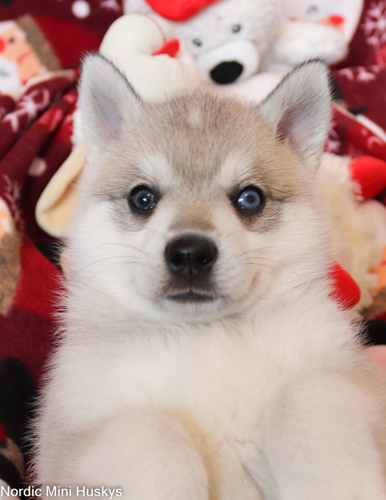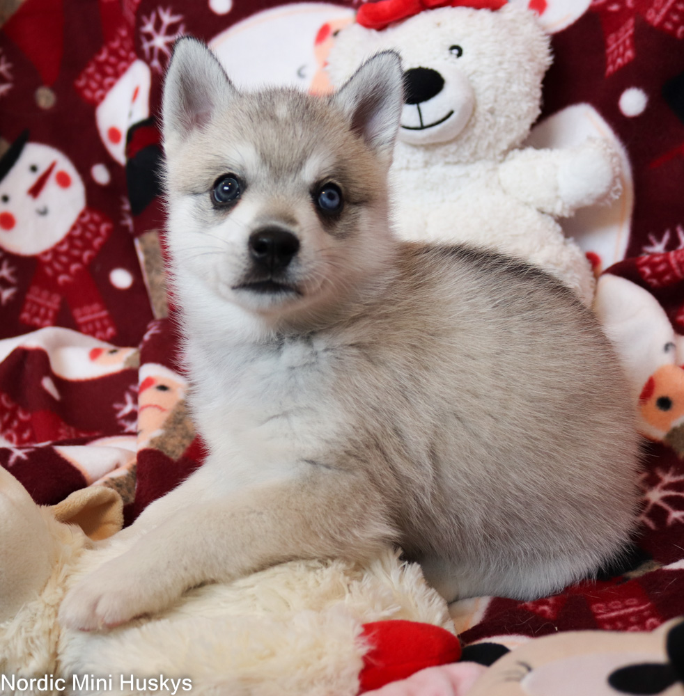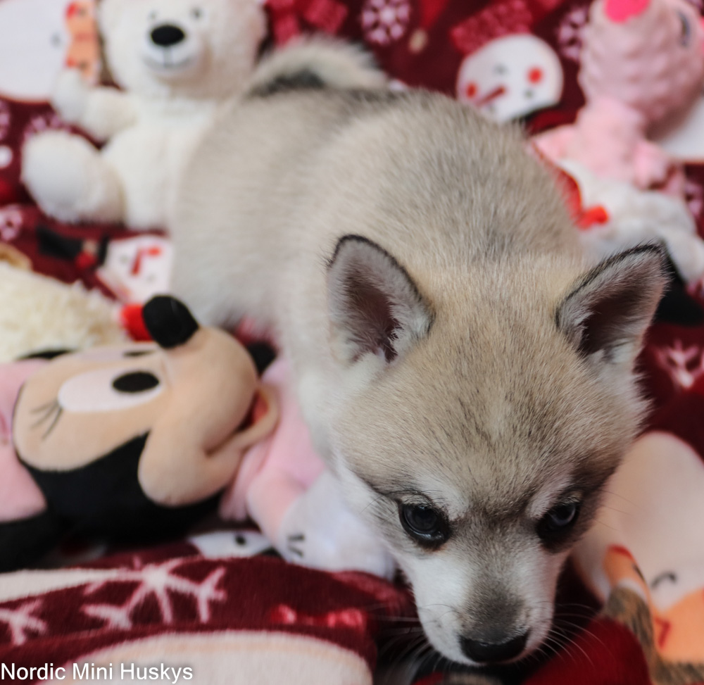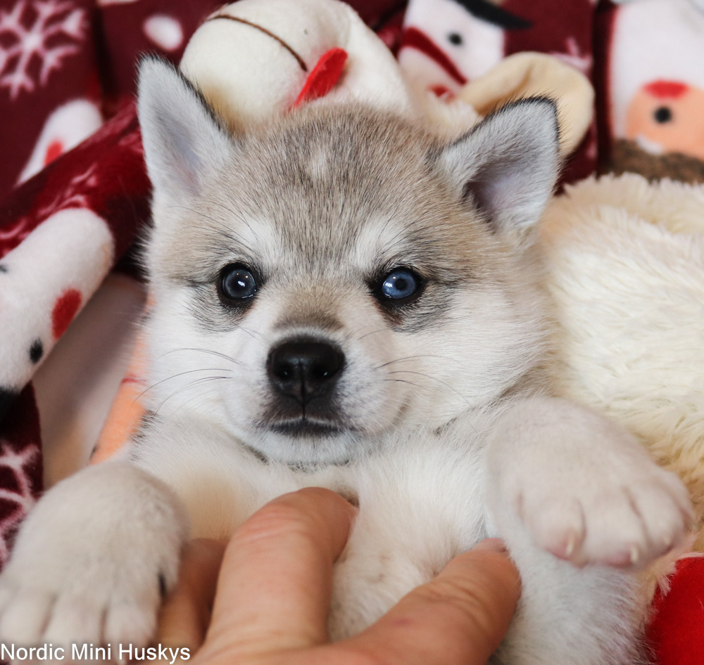 Venus’s grey and white bi eyed boy. This boy looks like he will be a small standard in size. He will darken with age. He is super playful, independent and super smart. He loves people once he gets to know them. He is big on playing with toys and is one of the first puppies to play with anything new I give them.
