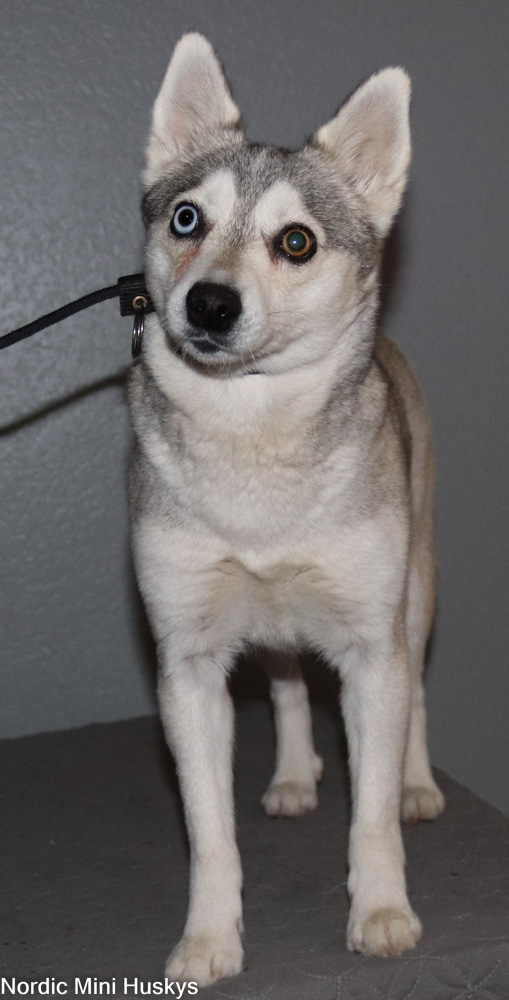 Cassiopeia was one of the most beautiful goddesses. She is a miniature grey and white blue eyed beauty. Fully health tested.